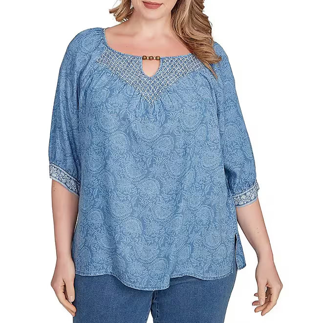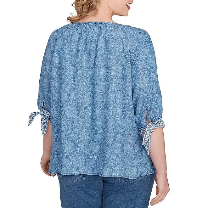 Plus Printed Keyhole Neck Elbow Tie Sleeve Top - Ruby Rd