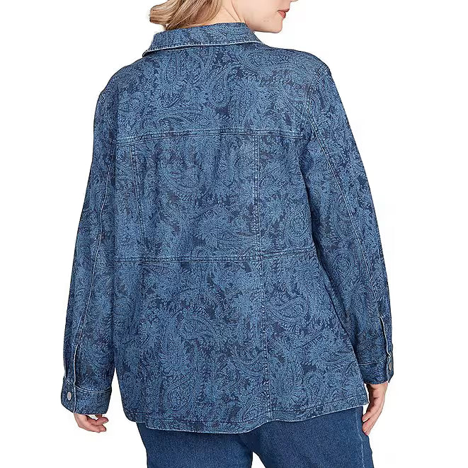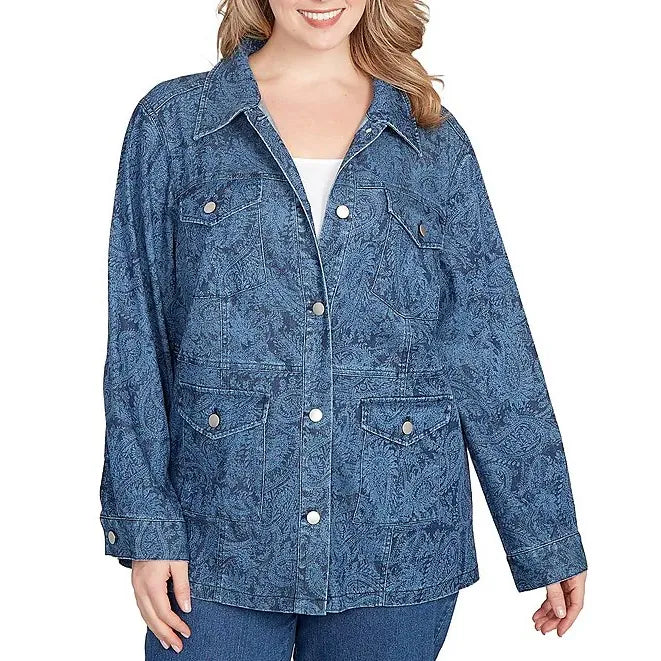 Plus Size Paisley Point Collar Long Sleeve Button Front Denim Jacket - Ruby Rd