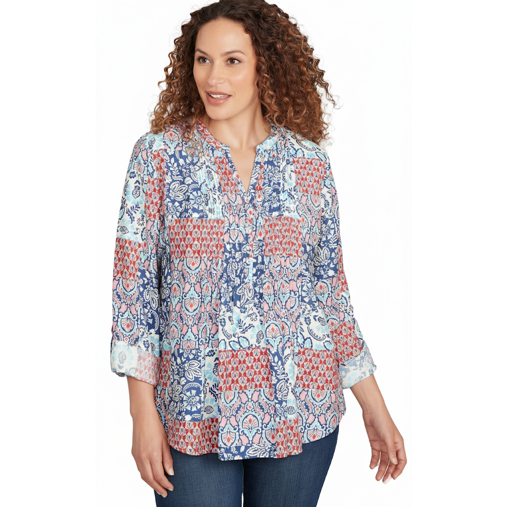 Plus Silky Voile Patchwork Split V-Neck Long Roll-Tab Sleeve Blouse - Ruby Rd