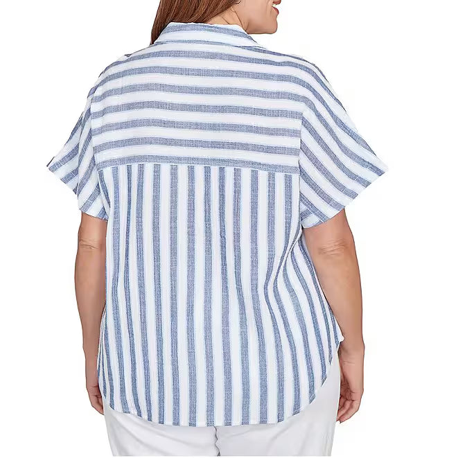 Plus Size V-Neck Short Sleeve Button Front Shirt Indigo Multi - Ruby Rd