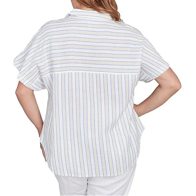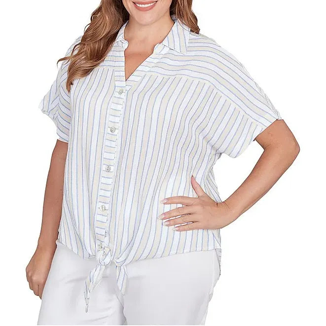 Plus Size V-Neck Short Sleeve Button Front Shirt Blue Sky Multi - Ruby Rd