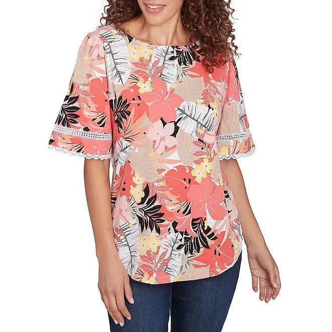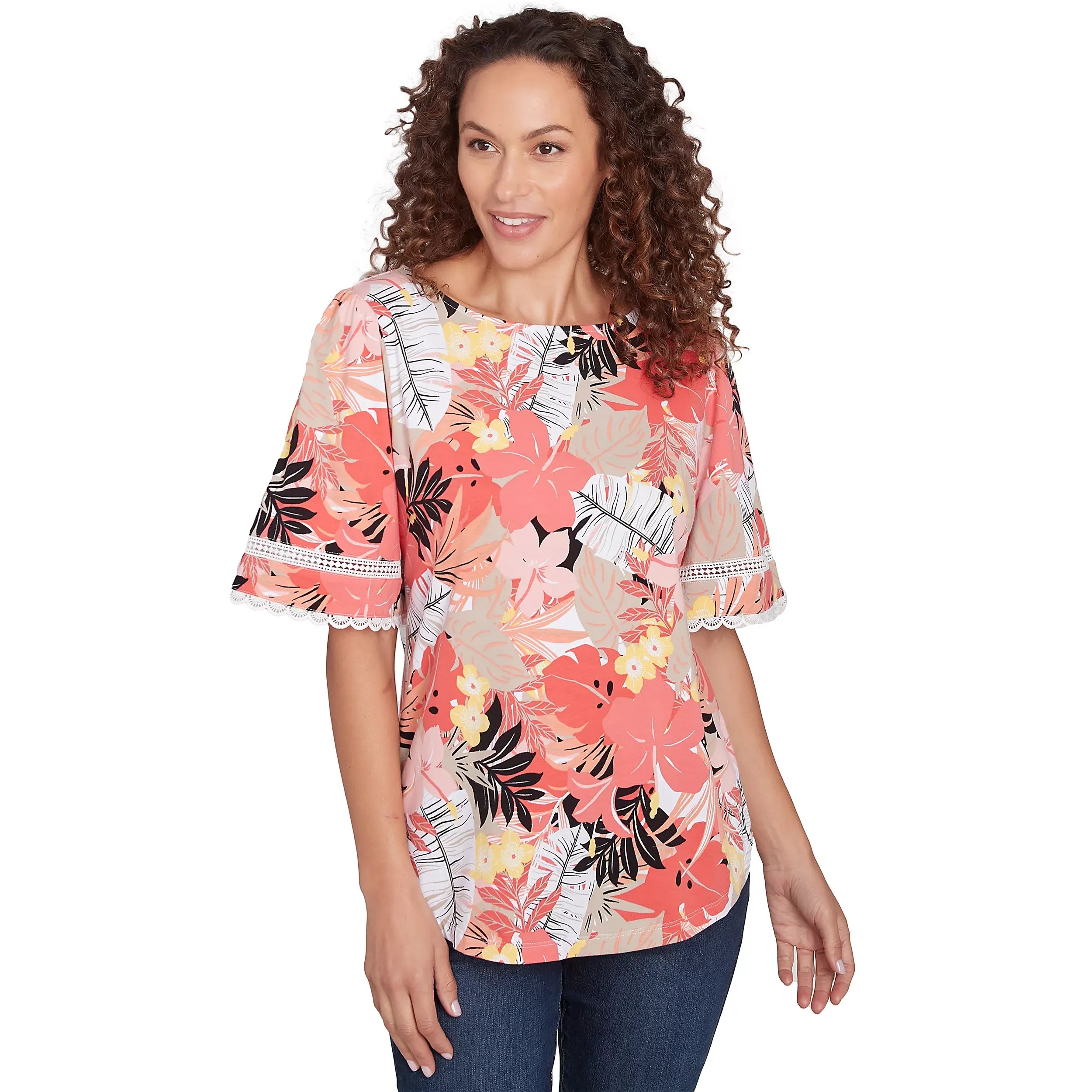 Knit Tropical Paradise Print Crew Neck Short Sleeve Top Grapefruit Multi- Ruby Rd