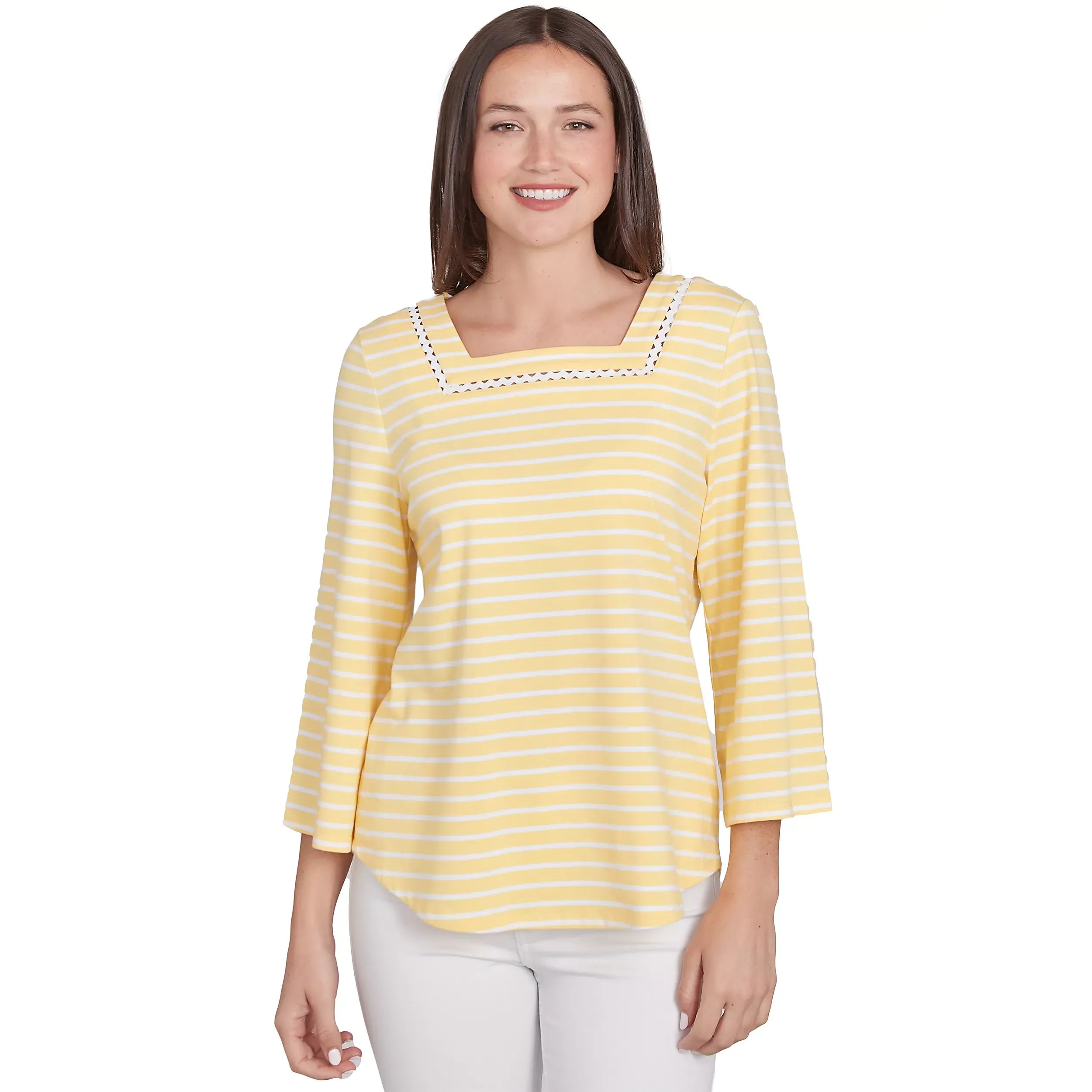 Knit Stripe Trim Square Neck 3/4 Bell Sleeve Top in Chattanooga Lemon Multi - Ruby Rd