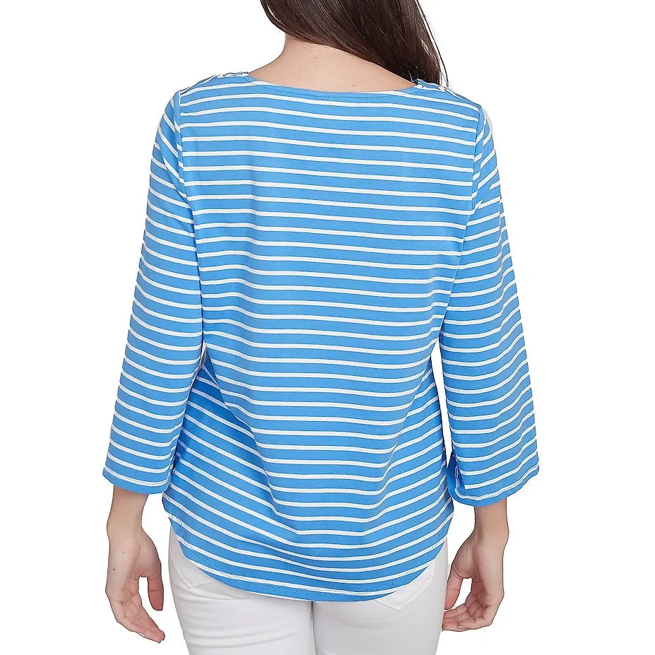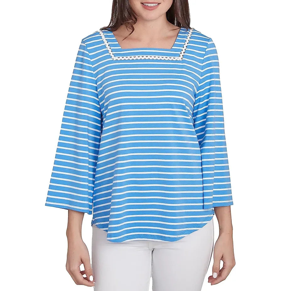 Knit Stripe Trim Square Neck 3/4 Bell Sleeve Top in Chattanooga Bluebird Multi - Ruby Rd