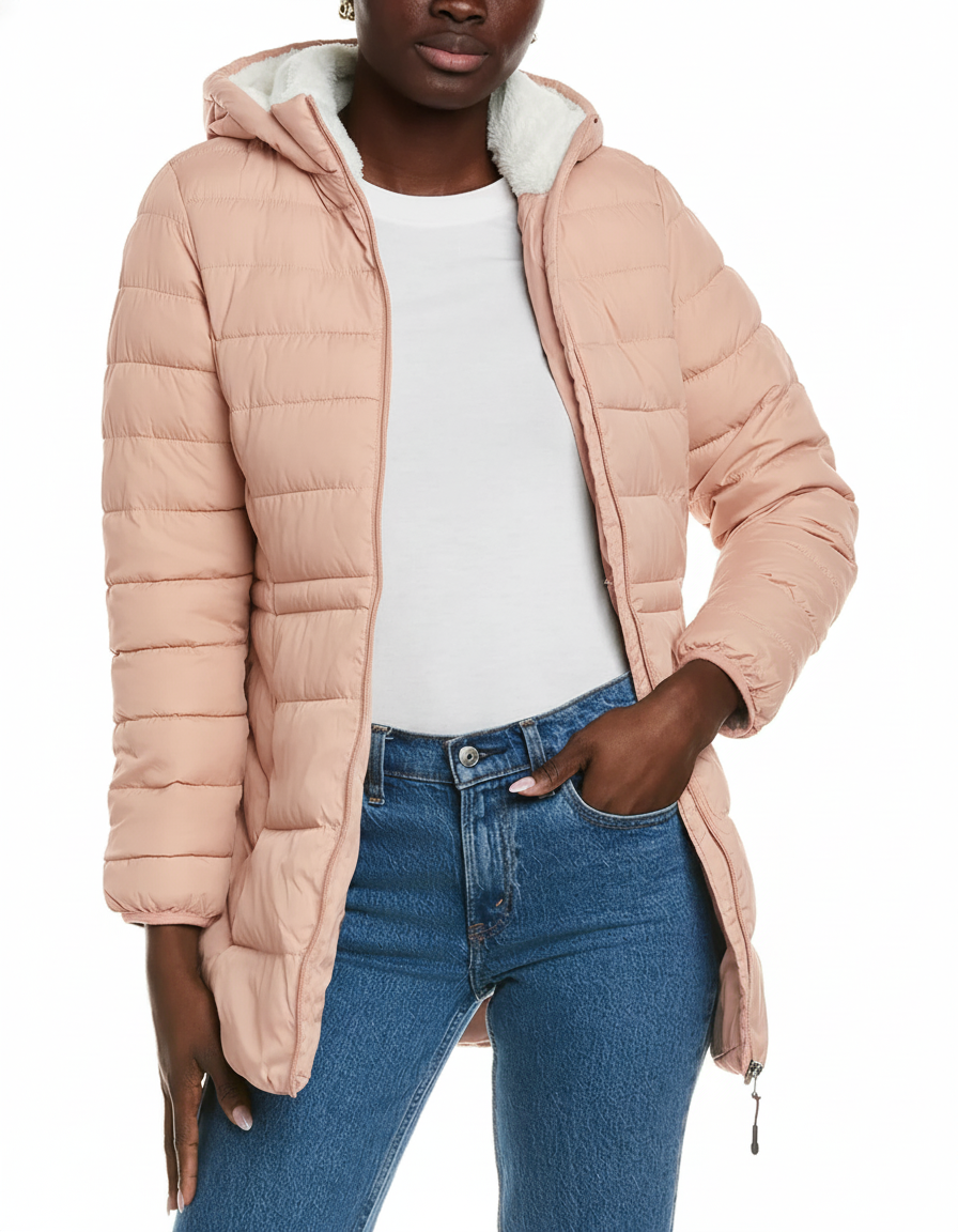 Puffer with Rabbit Fur Collar Blush