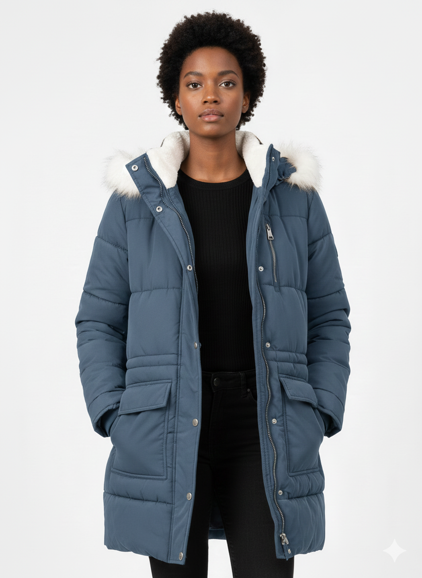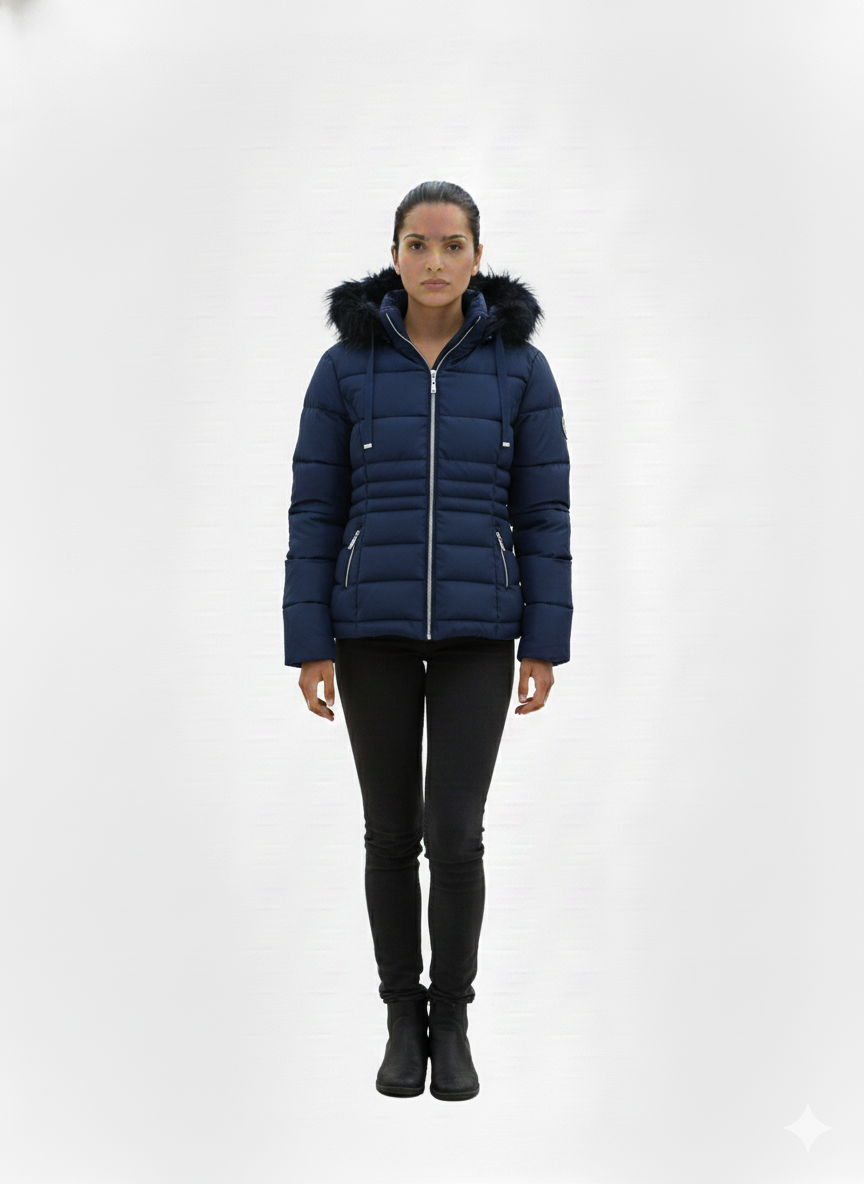 Faux Memory Fur Trim Coat Navy