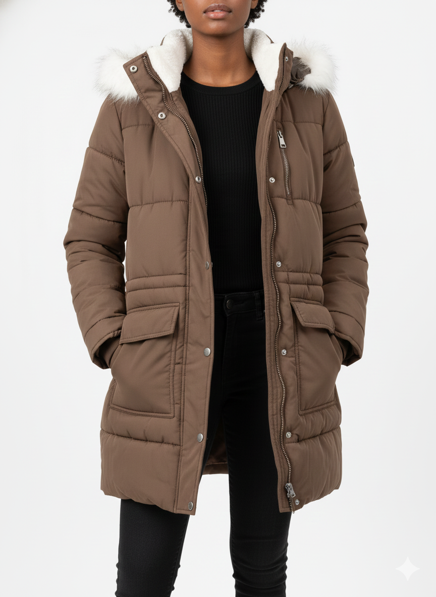 Puffer with Rabbit Fur Collar Camel