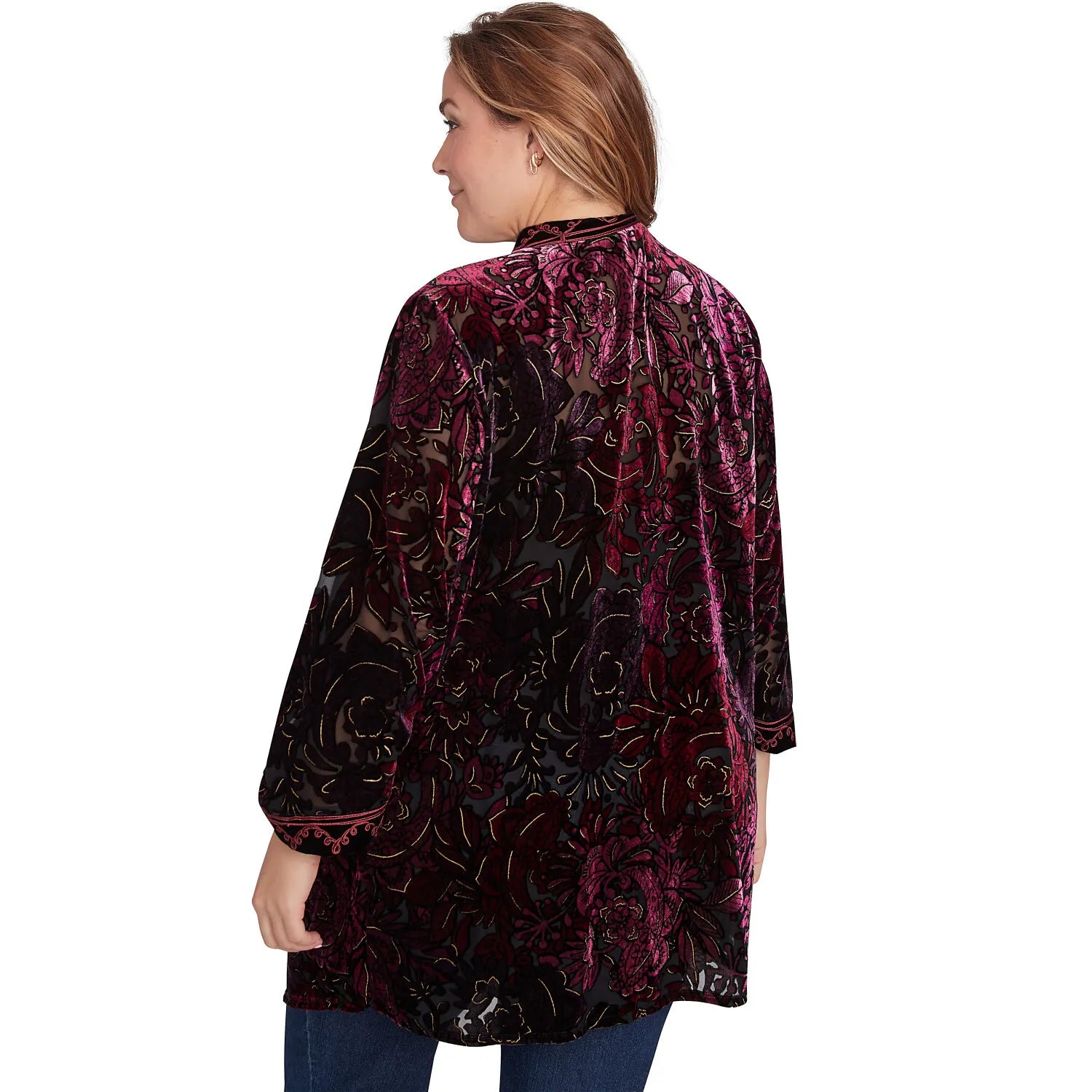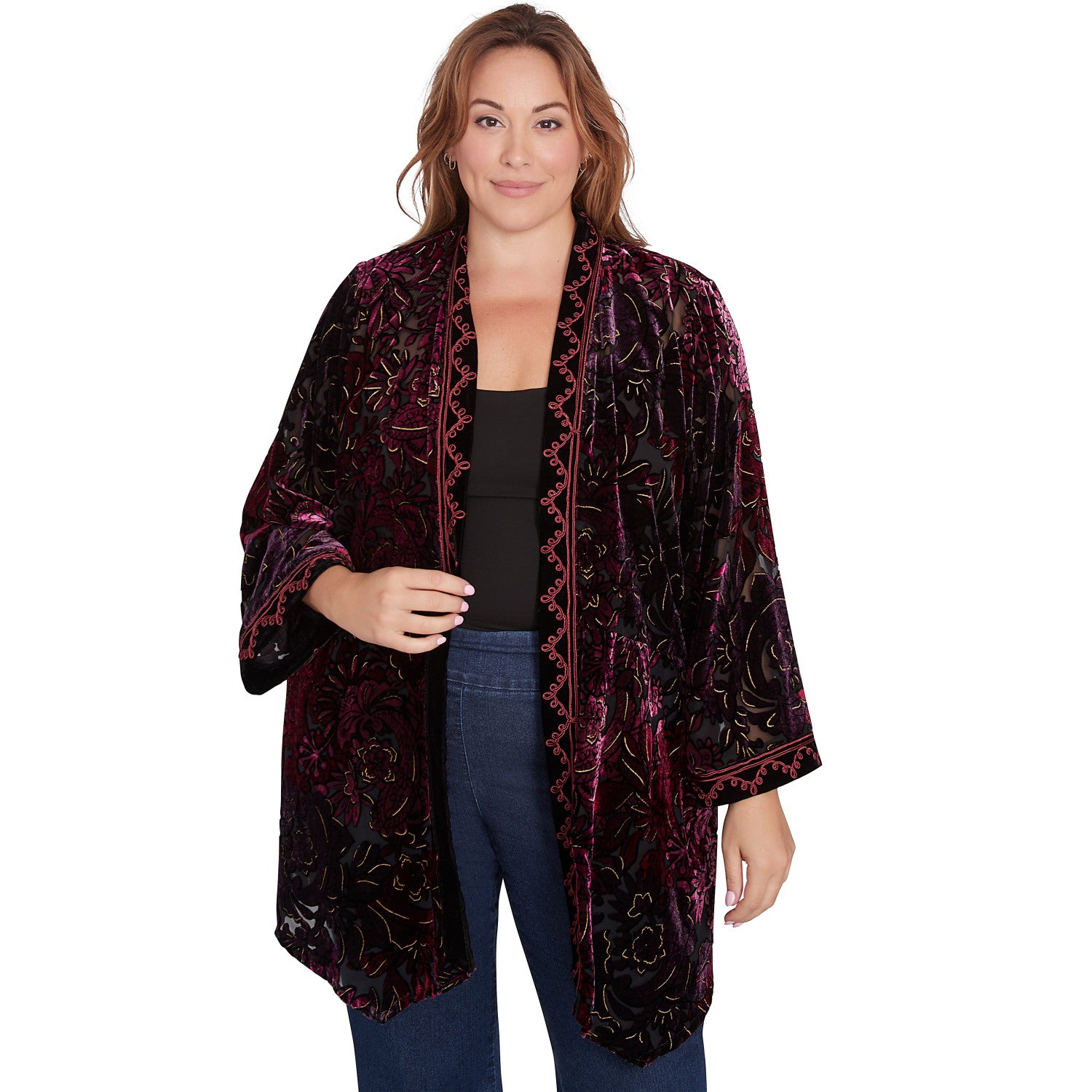 Plus Open Front Velvet Burnout Embroidered Cardigan Beet Multi -Ruby Rd