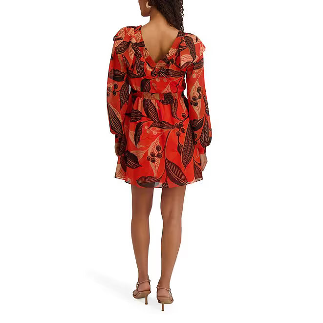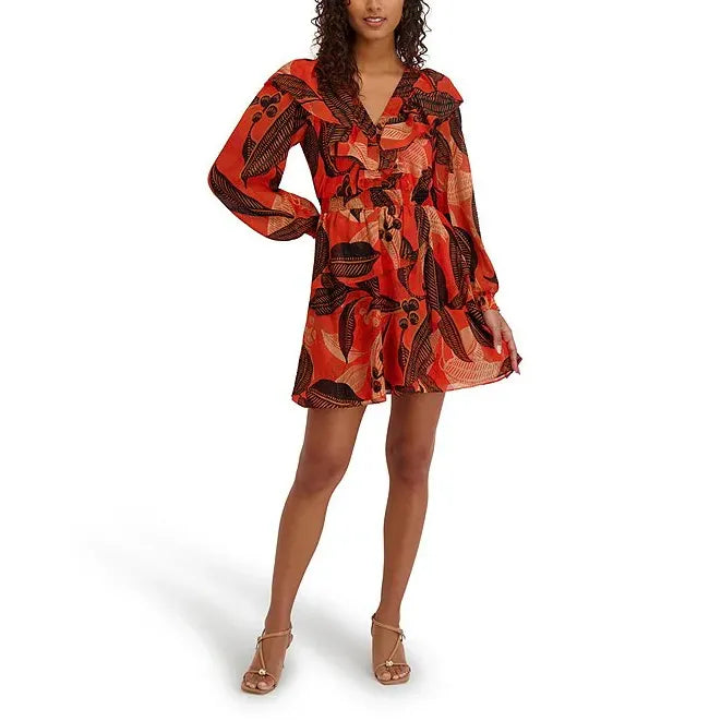 Printed Shimmer Lurex Plunge V-Neck Bishop Sleeves Ruffle A-Line Dress Orange Multi - Kensie