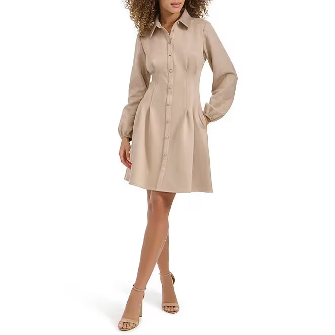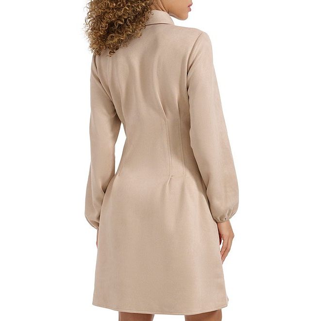 Faux Suede Collar Neck Long Sleeve Button Front Pleated Mini Dress Sand - Kensie