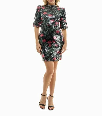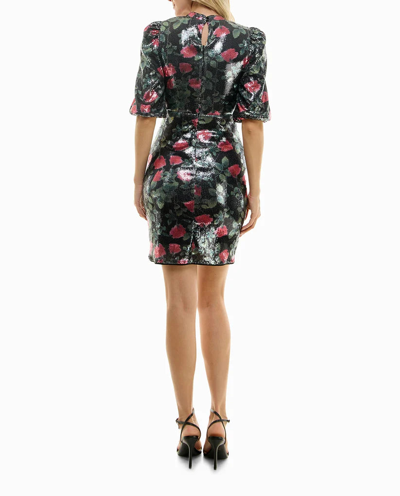 Sequin A -Line Dress Black Rose Print - Nicole Miller