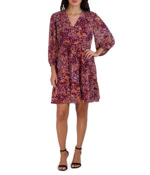 Red Floral Balloon Sleeve Babydoll Dress Purple/Rust - Sandra Darren